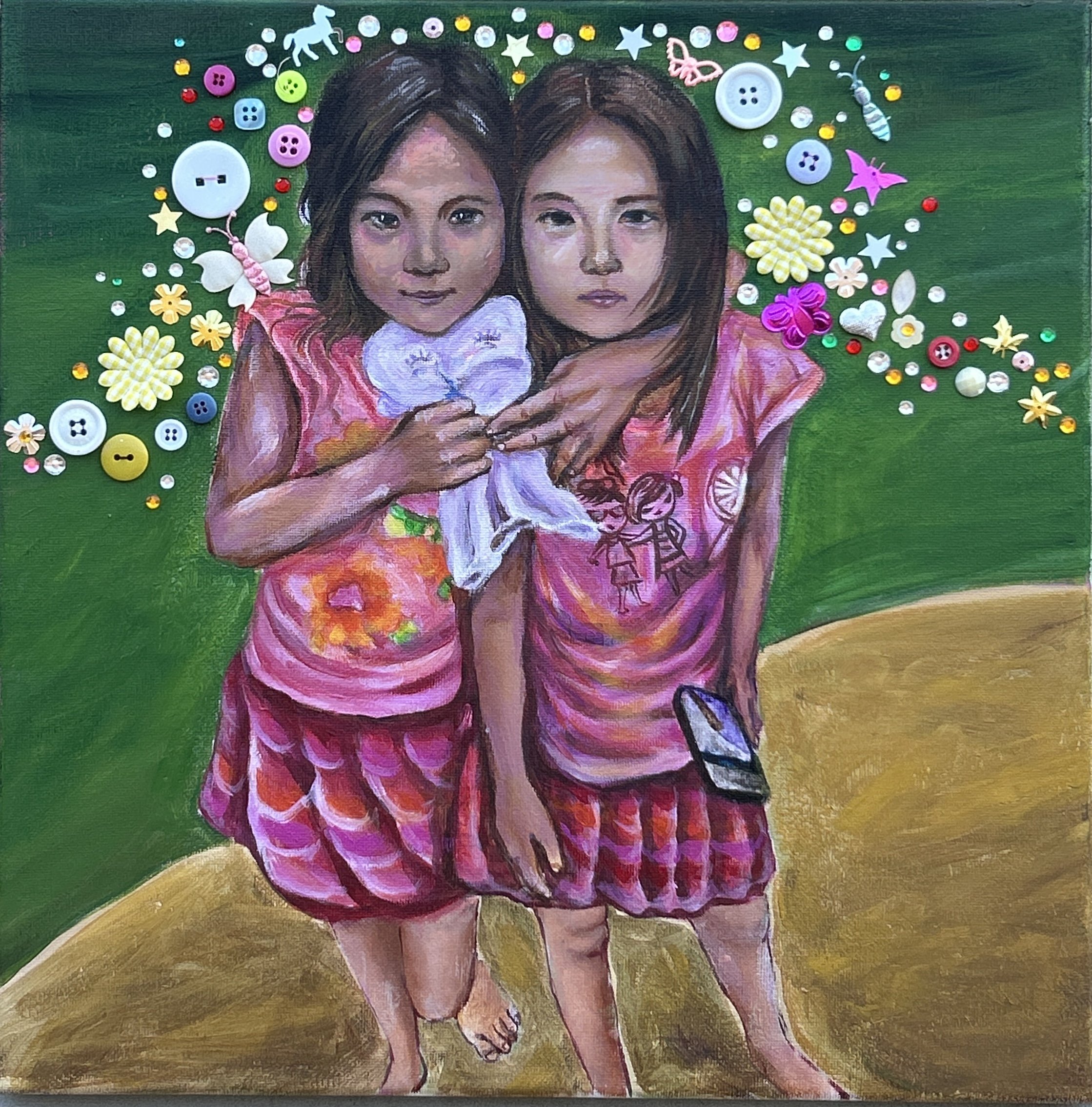 Growing up as a twin shaped a closeness defined by shared space, routines, and memories. Buttons and stitched elements connect the figures, referencing experiences formed side by side and the intimacy of being constantly paired.